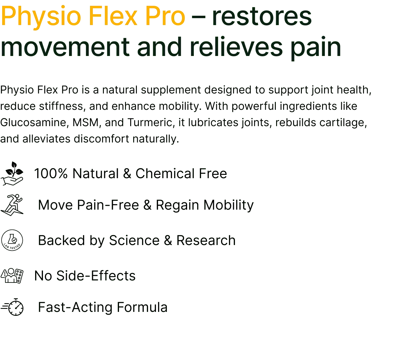 Physio Flex Pro is a joint support supplement designed to reduce inflammation, enhance flexibility, and improve mobility.